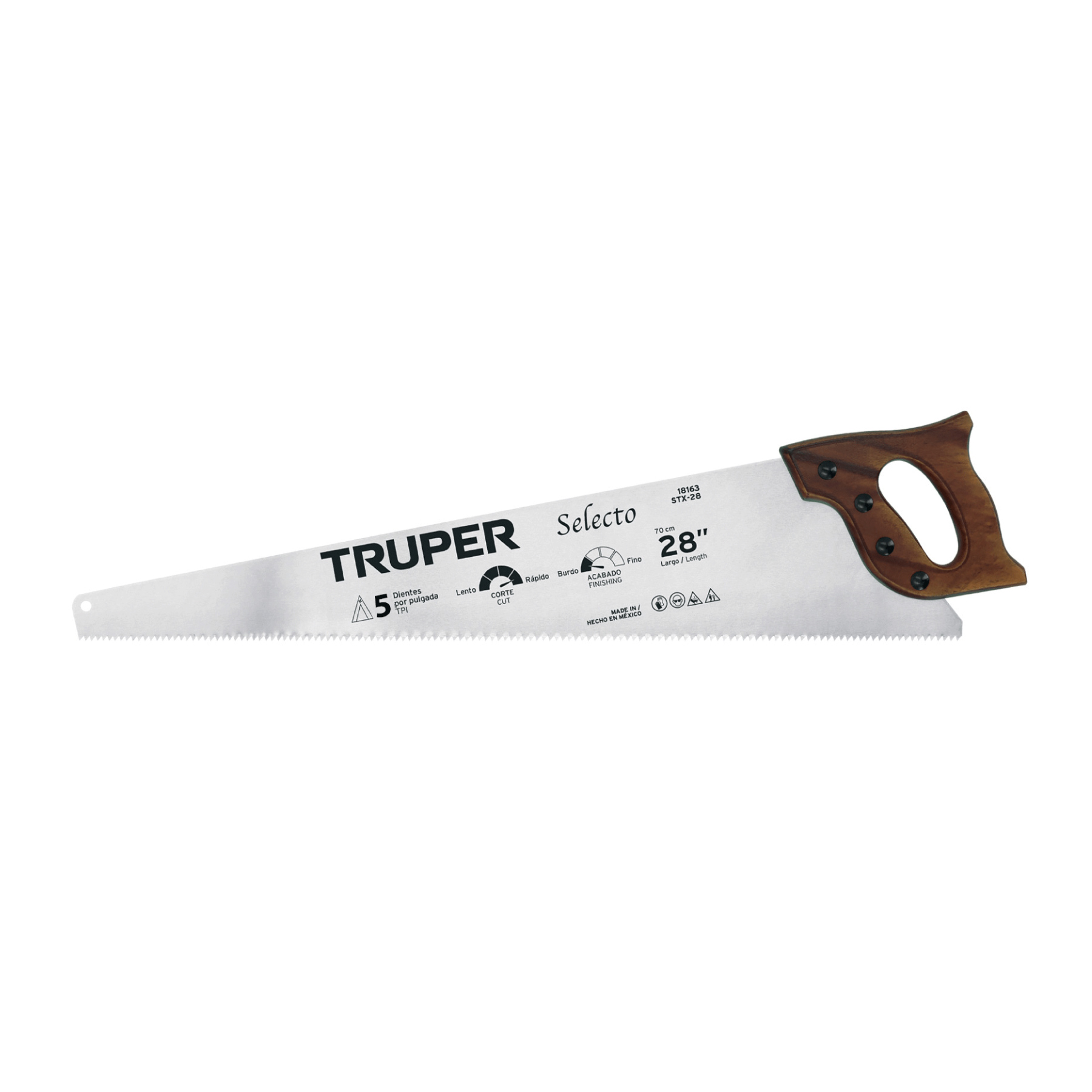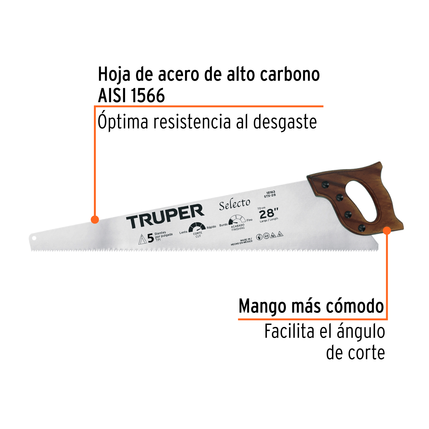 Serrucho 28″, Selecto, 5 DPP. Hoja de acero al alto carbono AISI 1566 para óptima resistencia al desgaste.