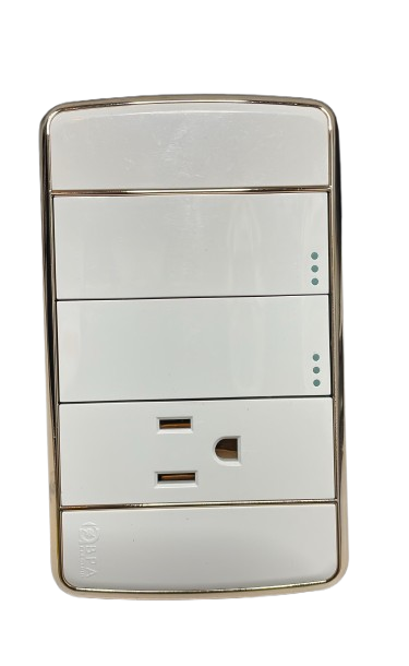 Placa armada con apagador doble y contacto en terminado blanco con dorado