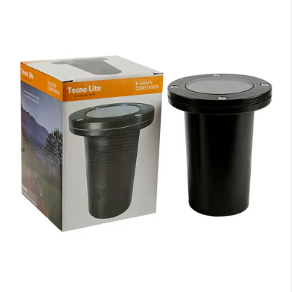 Base circular para empotar en piso CONSTANZA, para foco base E27 potencia maxima de 50w, compatoble con focos atenuables e inteligentes de 100-240v , medidas: 114mm x 16mm x 82 mm x 114 mm, fibra de vidrio en color negro mate con pantalla en cristal.