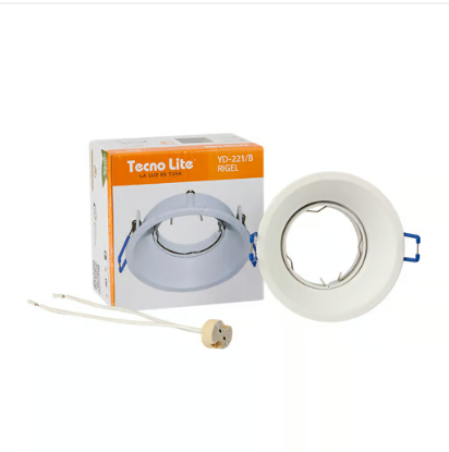 Base circular RIGEL empotrable para foco MR16 base Gx5.3 potencia maxima de 50w, compatible con focos atenuables 100-240v, medidas: 35 x 94 x 94 mm, terminado en color blanco