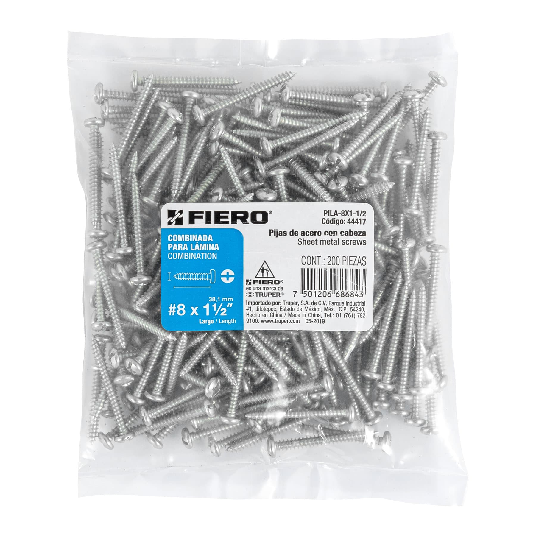 Bolsa con 200 pijas galvanizadas de #8 x 1-1/2″ para lamina, usada igual para unir objetos metálicos, madera, fibra de vidrio y plástico.