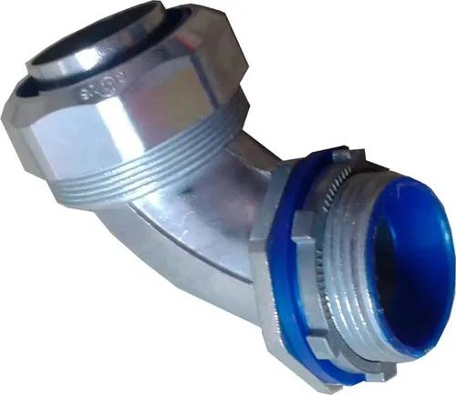 Conector curvo de 1 1/4″ (32mm) galvanizado para tubo licuatite, utilizado en instalaciones eléctricas de mediana y baja tensión