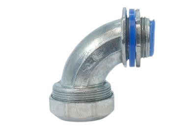 Conector curvo 3/4″ (19mm) galvanizado para tubo licuatite, utilizado en instalaciones eléctricas de mediana y baja tensión.