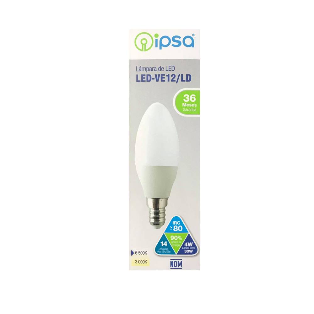 Lampara de led tipo vela entrada E12, 4w, luz de día 6500k, 100-240V~ 60Hz 4W 61mA 300lm.