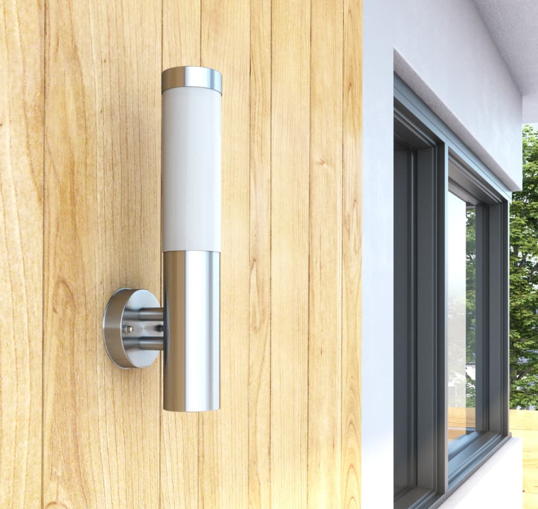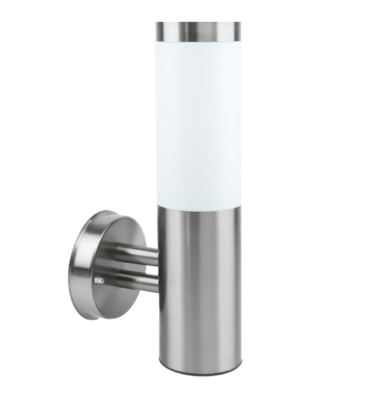 Luminaria arbotante para exterior con base para foco entrada normal e26, maxima potencia de 60w, medidas: 70*335*130 mm, IP54 terminado en acero inoxidable color plata y pantalla opalina