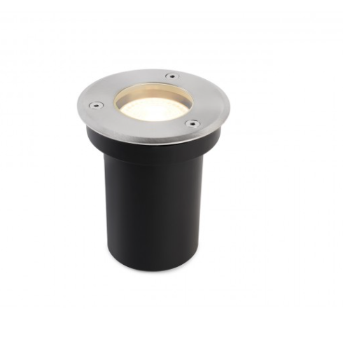Luminaria circular empotrable para piso, para foco de led entrada GU10, potencia maxima de 35w, a 127v, medidas: 9.8 cm x 11.5cm x 6.5, IP65 con terminado en acero inoxidable, pantalla de cristal