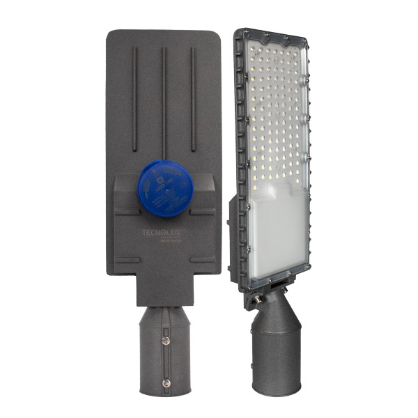 Luminaria para poste vial con fotocelda de 50w, luz blanca 6500k, terminado color gris.