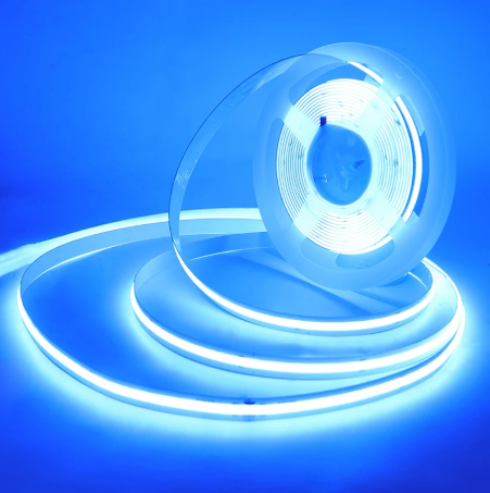 Tira de led cob 5mts en color azul a 12v para su instalacion se requiere driver (no incluye), con cinta doble cara, marca visible para corte
