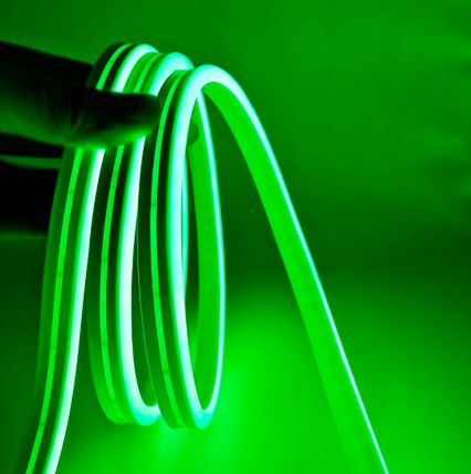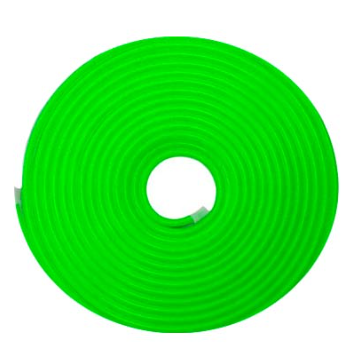 Tira de led neon en color verde de 5mts a 12v para su instalacion se utiliza driver (no incluye) marca visible para realizar el corte, incluye clips de fijacion
