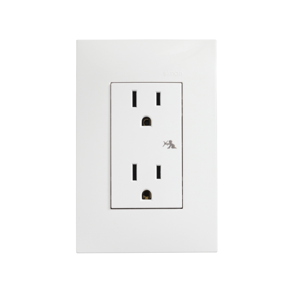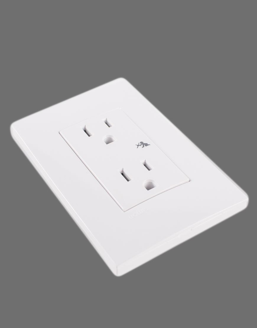 Toma de corriente dúplex color blanco, con chasis y placa.